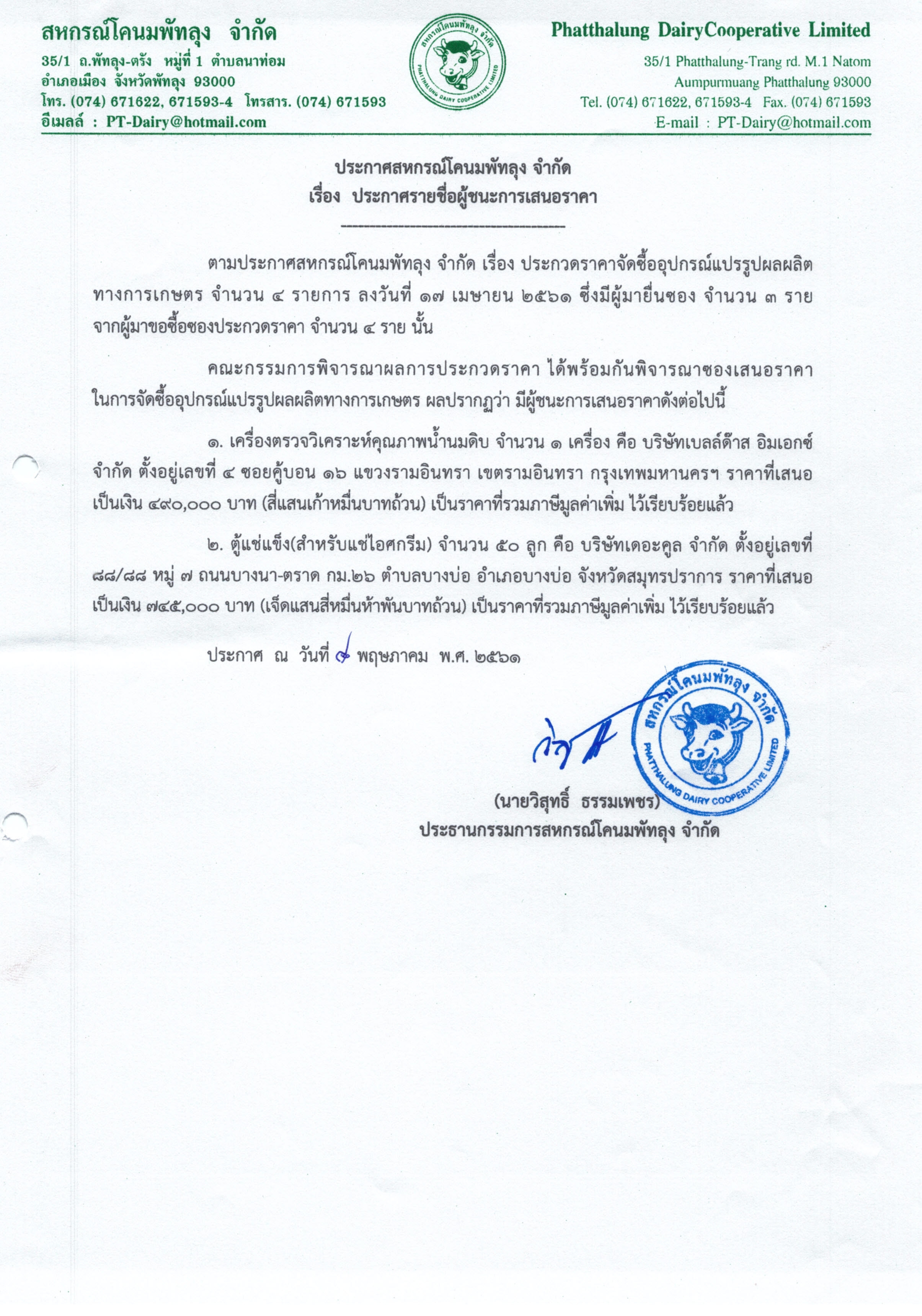 ประกาศรายชื่อผู้ชนะการเสนอราคา การประกวดราคาจัดซื้ออุปกรณ์แปรรูปผลผลิตทางการเกษตร ครั้งที่ ๑